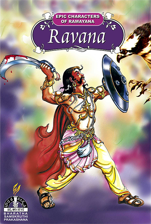 Ravana was born to Kaikasi and Vishravasa, and Pulatsya ( son of Prajapathi Brahma) was his grandfather. Kumbhakarna and Vibhishana were his brothers and Shoorpanakha was his sister. As he was born with ten heads, he was known as Dashagreeva, Dashanana, etc. He went to Gokarna with his brothers and performed such severe penance that Lord Brahma appeared before him and granted him a boon by virtue of which he would be immune to death at the hands of devas, danavas, yakshas, nagas and garuda. He also got back his nine heads that he had offered to Brahma as well as the power to take any form he liked. Following Sumali’s advice he demanded Lanka back from Kubera and waged war against him too. Later he married Mandodari and due to arrogance, came to be cursed by Nandikeshwara, one of Siva’s followers, saying that his end would come at the hands of monkeys. He received the divine weapons, Shakthi and Chandrahasa . He misbehaved with Vedavathi who swore that she would take birth again only to destroy him. He fought with many kings and this brought him to Ayodhya where again he fought with King Anaranya of the Ikshwaku dynasty. Before dying, the king proclaimed that Sri Rama of his dynasty would destroy him. Taking up Narada’s challenge, he laid siege on Yamaloka. There was no end to his evil ways as he went about challenging, killing, fighting and reveling in his victories. It was however left to Sri Rama, Lakshmana and the vanara warriors to bring about Ravana’s end as well as the end of many other rakshasas.