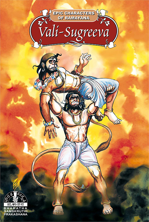 Vali and Sugreeva were born to a vanara maiden as a boon from Indra and Suryadeva respectively. Vali was crowned the king of Kishkinda. As a result of a number of boons he became invincible. When Ravana challenged his might, he simply carried the demon under his arm and smashed him down thus humiliating him. Ravana had to bow down to him and seek his friendship. There ensued a battle between Vali and Dundhubi, who came in the form of a wild buffalo. Vali destroyed him completely and hurled him in the sky. In doing so, the blood from the dying animal defiled Sage Matanga’s ashram due to which the sage cursed Vali and the vanaras saying that whoever came near his ashram would fall down dead. Mayavi, Dundubhi’s brother, retreated into a cave after challenging Vali. Vali followed him in leaving Sugreeva guarding the mouth of the cave . Poor Sugreeva who had been sworn not to enter the cave stood guard for more than a year after which he heard the loud scream of the rakshasa and then saw blood streaming out. Thinking that Vali had been killed, he shut the mouth of the cave with a boulder with the intention of preventing further damage at the hands of the demon. However, Vali returned , accused Sugreeva of usurping his place by deceit and banished him from Kishkinda. Sugreeva later on forged friendship with Rama and Lakshmana, killed Vali and helped Rama get back Sita after commanding an army himself at the battle of Lanka. On his deathbed, Vali heard Rama speak about dharma and made peace with Sugreeva. He asked him to take over the responsibility of the kingdom, his son Angada and his wife Tara. Sugreeva repented for bringing about his brother’s end, performed his last rites and helped him reach heaven. When Rama decided that it was time for him to get back to vaikunta, the purpose of his incarnation being over, Sugreeva was among those who accompanied him.